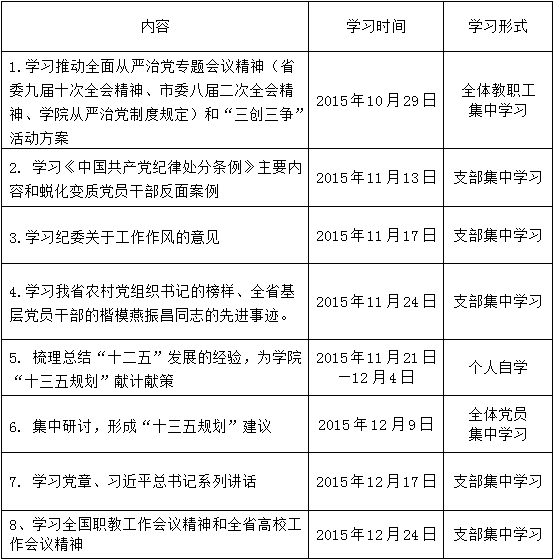 组织全体党员关注学院事业发展,为学院“十三五”发展出谋划策。要求每位党员于12月初向支部提交2条建议,12月上旬召开全体党员大会集中研讨,汇总后形成集体意见报学院活动领导小组办公室。